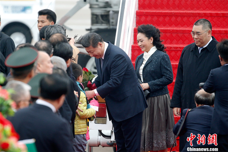 Staatspr?sident Xi und seine Ehefrau Peng werden beim Flughafen von dem Chefadministrator der chinesischen Sonderverwaltungszone Macao, Fernando Chui Sai On, begrü?t. |