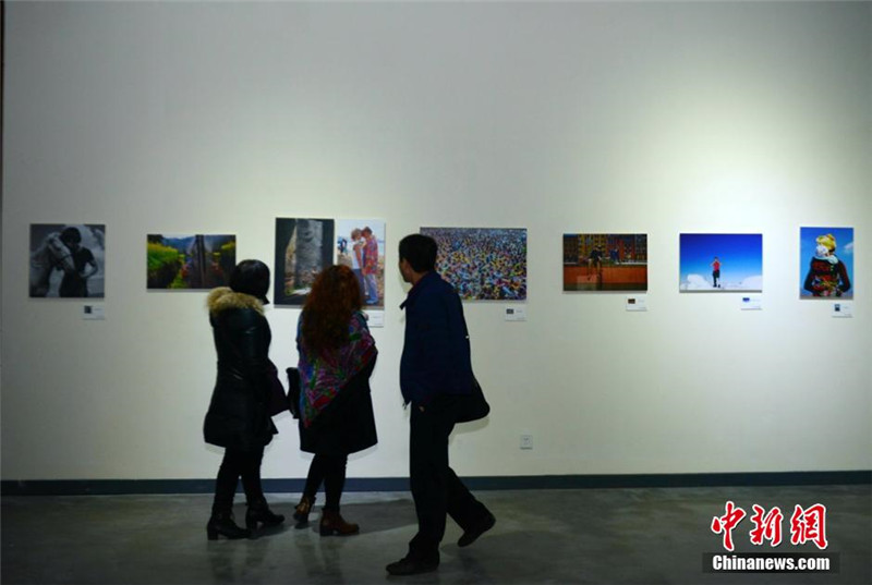 Besucher bestaunen die ausgestellten Fotos. |