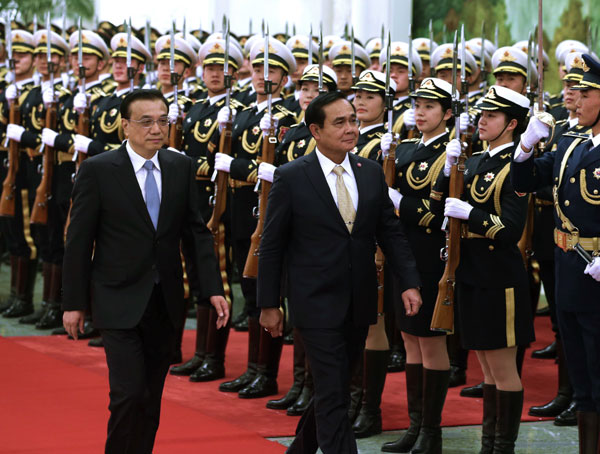 Premier Li Keqiang hat am Montag in Beijing seinen thail?ndischen Amtskollegen Prayut Chan-o-cha willkommengehei?en, nachdem sich die beiden bereits drei Tage zuvor in Bangkok getroffen hatten.