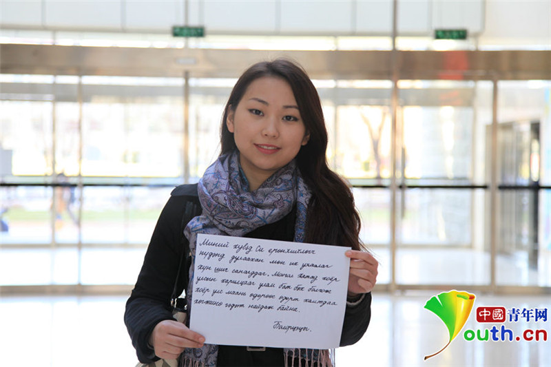 Diese charmante junge Dame kommt aus der Mongolei und studiert seit sechs Jahren in China. ?Wenn ?Uncle Xi‘ l?chelt, sind seine Augen kleiner. Er ist charmant, nett und zugleich ein m?chtiger Chef“, meint sie. Die Mongolin zeigt sich auch ganz angetan von Chinas First Lady Peng Liyuan. |
