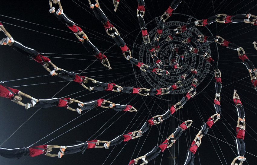 Die Schüler einer Shaolin-Kungfu-Kunstschule schweben w?hrend ihrer Aufführung an der Er?ffnungsfeier der Olympischen Jugendsommerspiele in Nanjing in der Luft. |