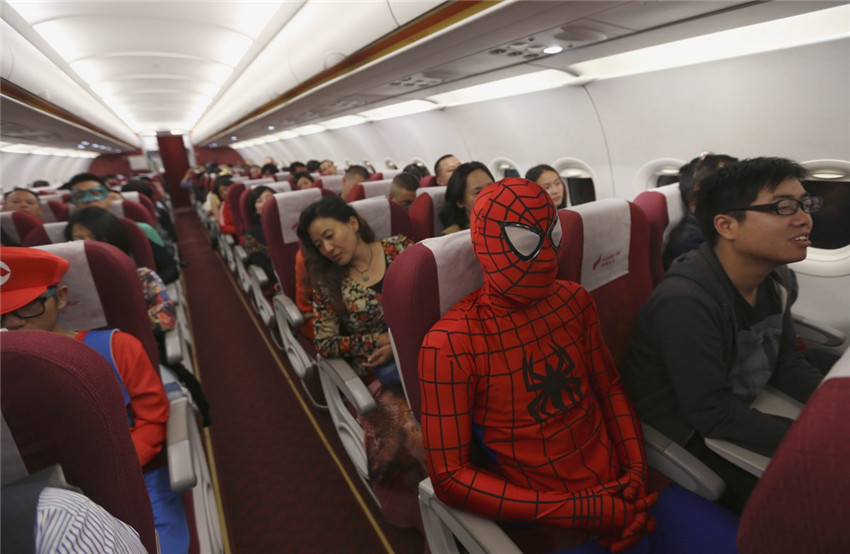 Ein Besatzungsmitglied der Lucky Air verkleidet sich an Halloween w?hrend dem Flug von Kunming nach Shenzhen als Spiderman. |