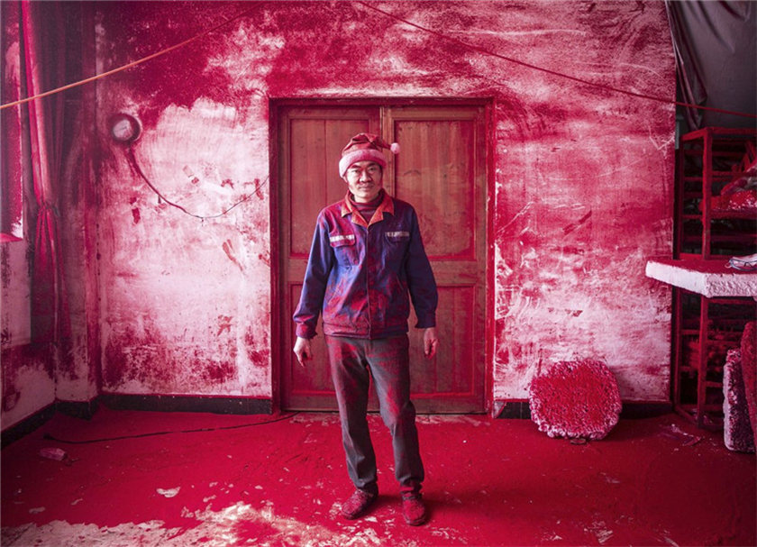 Ein Mann in Yiwu in der Provinz Zhejiang l?sst sich mit einer Weihnachtsmütze vor seiner Fabrik fotografieren, die Weihnachtsdekorationen herstellt. |