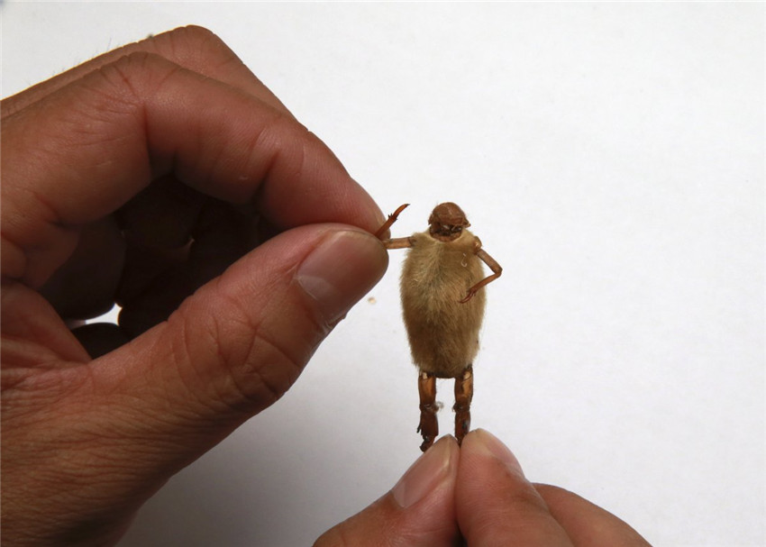 Volkskünstler Yu Guangjun befestigt zu Hause in Beijing die Beine einer Zikade an einer Magnolien-Knospe, um ein ?Maohou“ zu basteln. ?Maohou“ bedeutet haariger Affe und ist eine traditionelle Kunstform in Beijing, deren Anf?nge bis in die Qing-Dynastie (1644-1912) zurückreichen. |