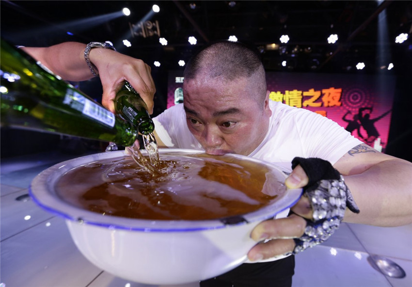 Ein S?nger trinkt in einem Beijinger Unterhaltungsclub Bier aus einer riesigen Schüssel. |