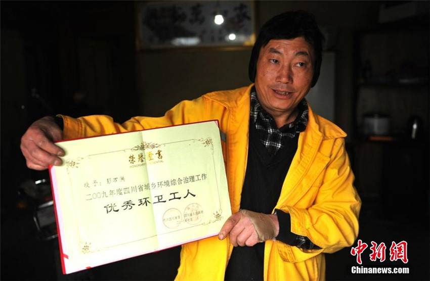 Peng zeigt mit Stolz seine Auszeichnung für die harte Arbeit. |