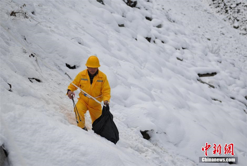 Verbunden mit einemAbsicherungsseil holt Peng den von Touristen weggeworfenen Abfall auf der Klippe. |