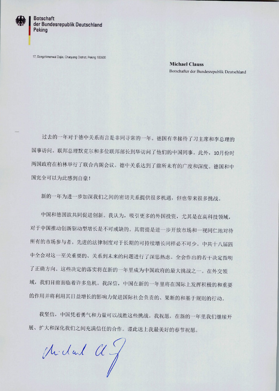 過去的一年對于德中關(guān)系而言是非同尋常的一年。德國有幸接待了習(xí)主席和李總理的國事訪問。聯(lián)邦總理默克爾和多位聯(lián)邦部長到華訪問了他們的中國同事。此外,10月份時(shí)兩國政府在柏林舉行了聯(lián)合內(nèi)閣會(huì)議。德中關(guān)系達(dá)到了前所未有的廣度和深度。德國和中國完全可以為此感到自豪!