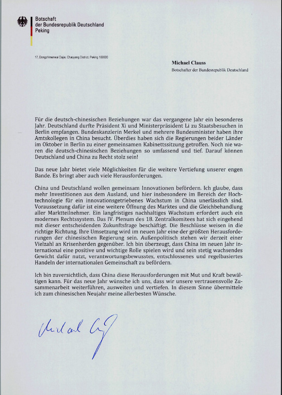 China und Deutschland wollen gemeinsam Innovationen bef?rdern. Ich glaube, dass mehr Investitionen aus dem Ausland, und hier insbesondere im Bereich der Hochtechnologie für ein innovationsgetriebenes Wachstum in China unerl?sslich sind. Voraussetzung dafür ist eine weitere ?ffnung des Marktes und die Gleichbehandlung aller Marktteilnehmer. Ein langfristiges nachhaltiges Wachstum erfordert auch ein modernes Rechtssystem. Das IV. Plenum des 18. Zentralkomitees hat sich eingehend mit dieser entscheidenden Zukunftsfrage besch?ftigt. Die Beschlüsse weisen in die richtige Richtung. Ihre Umsetzung wird im neuen Jahr eine der gr??ten Herausforderungen der chinesischen Regierung sein. Au?enpolitisch stehen wir derzeit einer Vielzahl an Krisenherden gegenüber. Ich bin überzeugt, dass China im neuen Jahr international eine positive und wichtige Rolle spielen wird und sein stetig wachsendes Gewicht dafür nutzt, verantwortungsbewusstes, entschlossenes und regelbasiertes Handeln der internationalen Gemeinschaft zu bef?rdern.