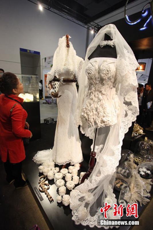 Besonders gro?e Aufmerksamkeit erregten zwei attraktive Brautkleider, die mit Nylonpulver gedruckt wurden. Die beiden Brautkleider sollen so weich und rei?fest wie normale Brautkleider sein. Ihr Preis ist jedoch um ein Vielfaches h?her. Der Schleier allein kostet gegen 20.000 Yuan (3000 Euro). Kein Wunder, dauerte sein Druck doch eine ganze Woche.