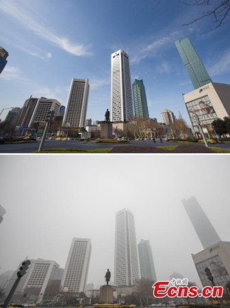 Das Bild zeigt die Skyline von Nanjing (Provinz Jiangsu) w?hrend eines Tags mit starker Smogbildung (26. Januar) und eines sch?nen Tags (10. M?rz).