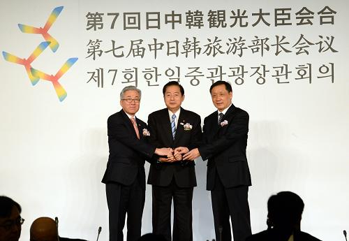 Kim Jong-deok, der südkoreanische Minister für Kultur, Sport und Tourismus (links), Japans Land- und Verkehrsminister Akihiro Ota (mitten) und Li Jinzao, Direktor der Staatlichen Tourismusverwaltung Chinas