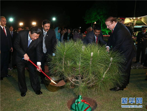 Chinas Staatspr?sident Xi Jinping und der pakistanische Premierminister Nawaz Scharif pflanzen zusammen einen Baum im Zeichen der Freundschaft