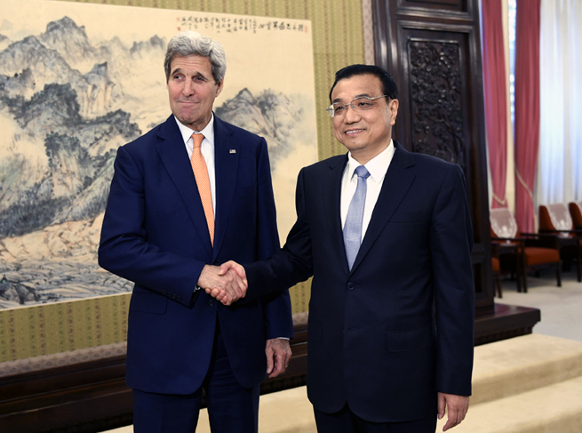 Chinas Premierminister Li Keqiang hat am Samstag in Beijing den amerikanischen Au?enminister John Kerry empfangen. Beide Seiten tauschten Meinungen über regionale und internationale Fragen von gemeinsamem Interesse aus.