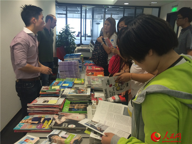 An einem Bücherstand werden deutsche Zeitschriften und Zeitungen sowie die Unterrichtsmaterialien des Goethe-Instituts verkauft. |