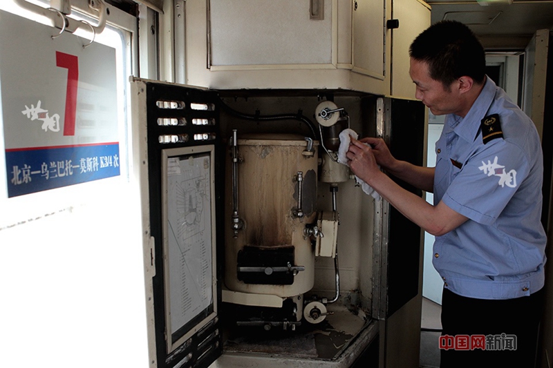 Ein Zugbegleiter reinigt den Wasserkocher. |