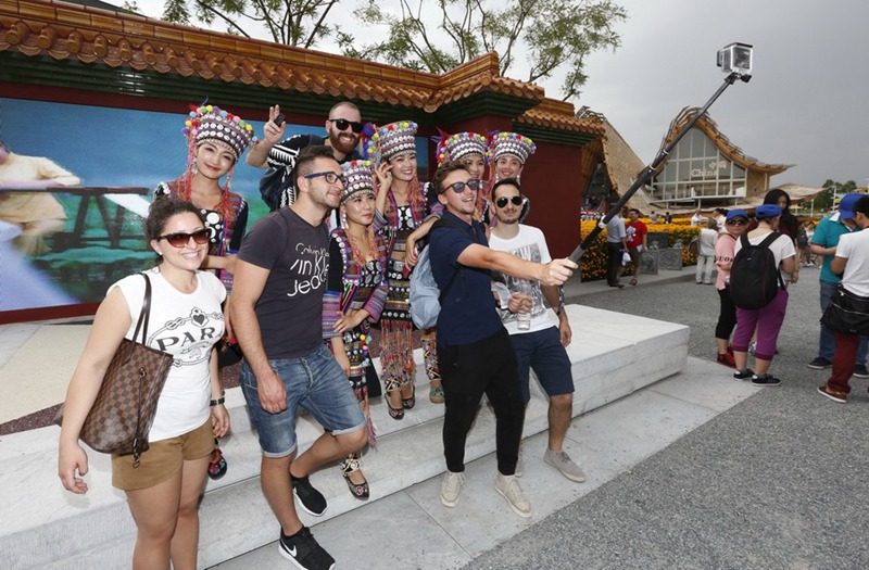 Besucher aus Italien beim Schnappschuss mit T?nzerinnen aus der südwestchinesischen Provinz Yunnan. |