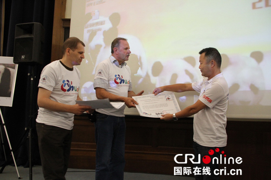 Zwei belgischen Pandafans werden bei der Pressekonferenz Zeugnisse über die Mitgliedschaft in der Reisegruppe verliehen. |