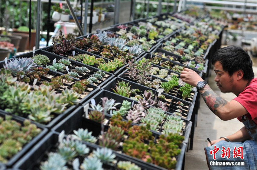 Liu Jie kam im Jahr 2010 zum ersten Mal mit Sukkulenten in Berührung. Heute betreibt er ein Café in Kunming, der Hauptstadt der Provinz Yunnan, in dem die Kunden diese auch kaufen k?nnen. Er hat sogar in einem Vorort von Kunming ein spezielles Gew?chshaus für seine Sukkulenten-Zucht gebaut. |