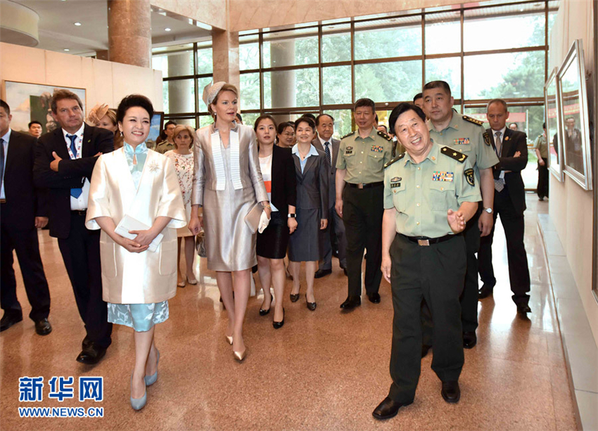 Peng Liyuan und K?nigin Mathilde bestaunen die pr?sentierten Musikwerke der Kunstakademie der Volksbefreiungsarmee. |