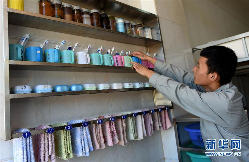 A Long r?umt seine Zahnputzsachen im Gemeinschaftsbad auf. |