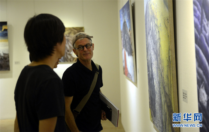 Der amerikanische Künstler Christopher Schink und Nie Zihui diskutieren über die Schaffung von Temperabildern. |