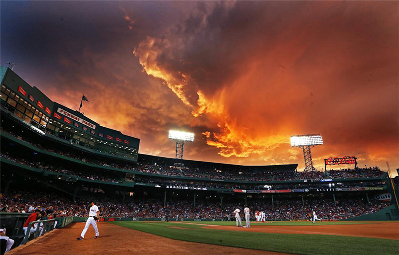 über dem Fenway-Park in Boston scheint der Himmel zu brennen. |