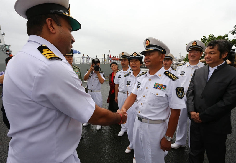 Flottillenadmiral Wang Jianxun, der stellvertretende Stabschef der chinesischen Ostflotte, spricht mit einem Vertreter der indischen Marine. |