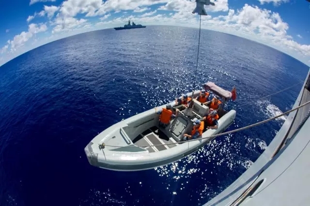 14:00 Eine übung zum Personaltransport mit dem Motorboot zwischen Schiffen beginnt. |