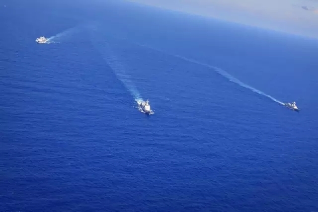 15:00 Ein Konvoi aus drei Schiffen übt die Fahrt in der Gruppe. |