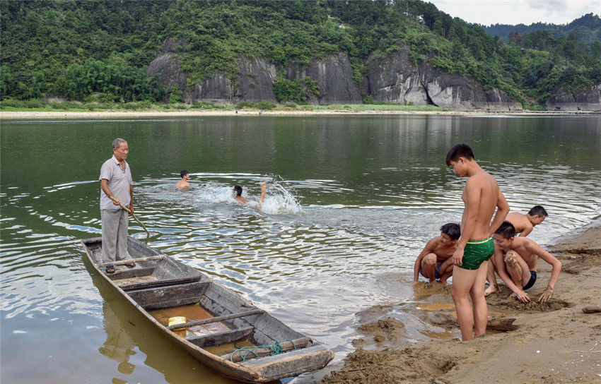 Liang ermahnt junge Leute, die am Fluss spielen, dass sie auf ihre Sicherheit achten sollen. |