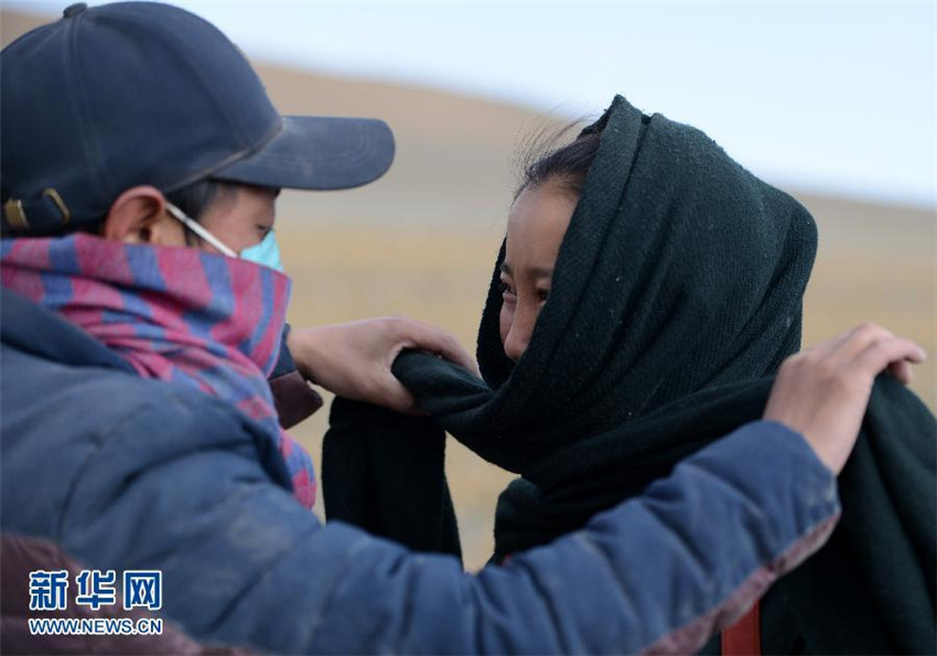 Bamus Ehemann Dala stellt vor der Abfahrt seiner Frau sicher, dass ihr Kopftuch richtig sitzt. |