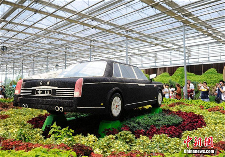In der ?Halle der innovativen Landwirtschaft“ k?nnen die Besucher einen Hongqi L9 bestaunen, der komplett aus verschiedenen Bohnen- und Samenarten besteht. |