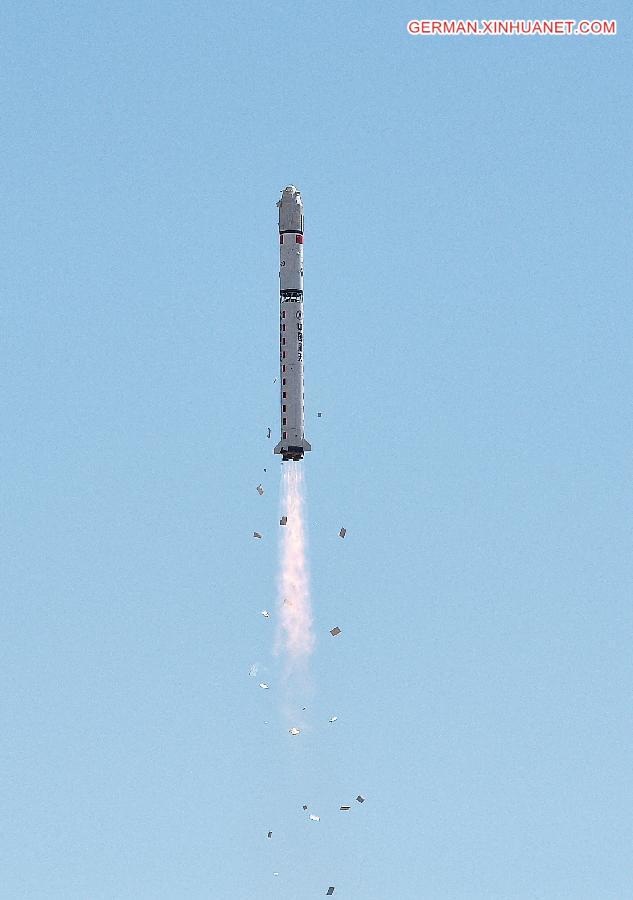 Eine ?Langer Marsch-2D" Tr?gerrakete, die den hochaufl?senden ?Gaofen-9" Satelliten für Erdbeobachtung tr?gt, hebt am 14. September 2015 vom Startplatz auf dem Satelliten-Startzentrum in Jiuquan in der nordwestchinesischen Provinz Gansu ab. Sie wird für Landvermessung, Stadtplanung, Sch?tzung des Ernteertrags und Katastrophenschutz eingesetzt.