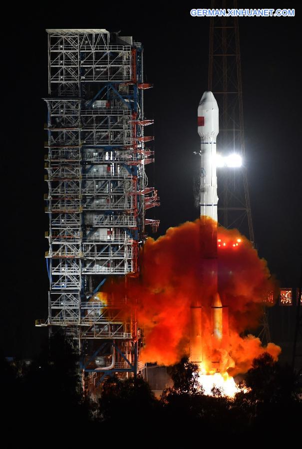 Eine ?Langer Marsch-3B/Yuanzheng-1" Rakete, die zwei Satelliten der neuen Generation für BeiDou-Satellitennavigationssystem tr?gt, wird am 25. Juli 2015 aus dem Startzentrum Xichang in der südwestchinesischen Provinz Sichuan gestartet. China habe um 8.29 Uhr Beijinger Zeit am Samstag erfolgreich zwei Satelliten für sein eigenst?ndiges globales Navigations- und Positionsnetzwerk geschossen, verkündete das Startzentrum.