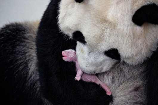 Laut Wissenschaftlern sollten bei der künstlichen Aufzucht von Pandas die menschlichen Eingriffe bestm?glich versteckt werden, damit die B?ren für das Leben in der Wildnis vorbereitet werden. Das Bild zeigt eine Panda-Mutter dabei, wie sie ihr Junges umsorgt.