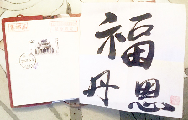 Das Wanderbuch von Daniel Sattler und eine Kalligraphie seines chinesischen Namens ?Fu Dansi“, was man sehr frei als ?Denk-Rot Segen“ übersetzen k?nnte.