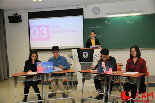Bei der Debatte argumentierten jeweils zwei Studenten (eine Studentin und ein Student) für Merkel und Schulz. Wang Yiqing und Jia Xiaoyu unterstützten Angela Merkel, die jetzige Bundeskanzlerin und Spitzenkandidatin der Unionspartei. Sun Rui und Wei Tianran unterstrichen die Kompetenz von Martin Schulz, einst Vorsitzender des EU-Parlaments und neuer SPD-Chef. Zhao Yubaiyang übernahm die Moderatorion. Sun Jiayan erl?uterte vor Diskussionsbeginn mit einem Video das Wahlsystem der Bundesrepublik Deutschland. Andere Studenten der Klasse bildeten die Jury. Die vollst?ndige Debatte dauerte etwa eine halbe Stunde und bestand aus drei Teilen, einem Anfangsstatement, einer freien Debatte und dem Schlussstatement.