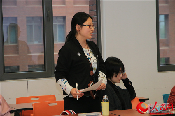 Professorin Wu Jiang (links) betrachtet aufmerksam die Debatte ihrer Studenten.