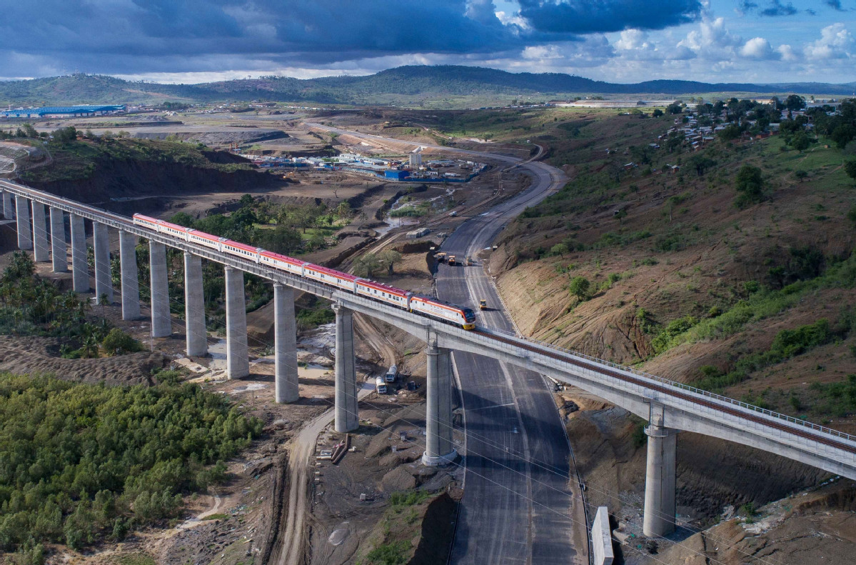 Ein Zug f?hrt auf einer Brücke von einer von China gebauten Eisenbahn, die Kenyas Hauptstadt Nairobi mit Mombasa und Naivasha verbindet. (Foto/Xinhua)
