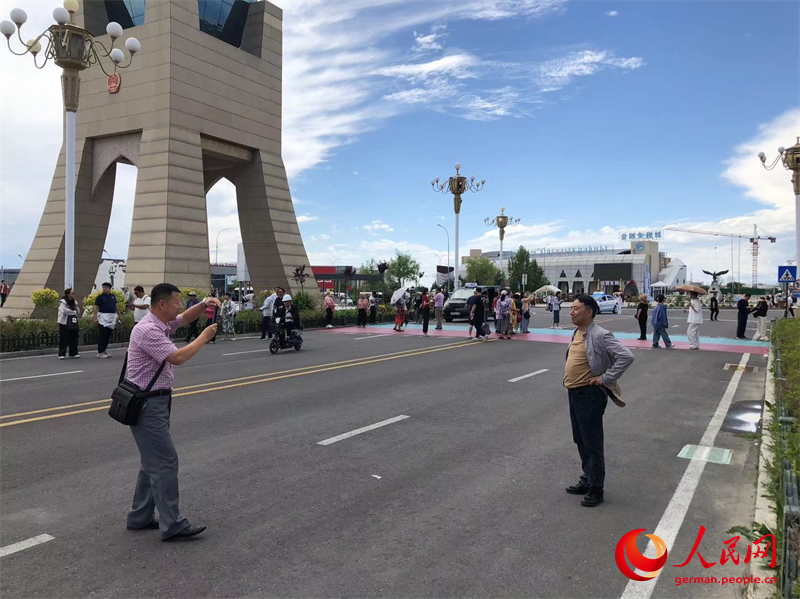 Touristen machen Fotos vor dem rot-blauen Grenzstreifen, der Landesgrenze markiert. (Foto: People’s Daily Online/Oliver Fritzsch)