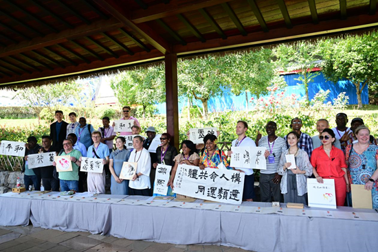 Mitglieder des Medienkooperationsforums der ?Belt and Road“-Initiative 2024 zeigen Kunstwerke, die in Zusammenarbeit mit Künstlern aus dem Emei-Gebirge entstanden sind. (Foto: Chen Chun'an)