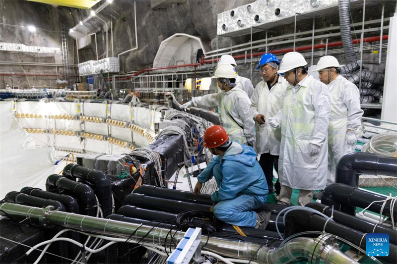 Wang Yifang (2. v. r.), leitender Wissenschaftler des Jiangmen Underground Neutrino Observatory (JUNO), und Ma Xiaoyan (4. v. r.), leitender Ingenieur des JUNO, überprüfen den Status der Flüssigkeitsfüllung des JUNO in Jiangmen, südchinesische Provinz Guangdong, 18. Dezember 2024. (Xinhua/Jin Liwang)