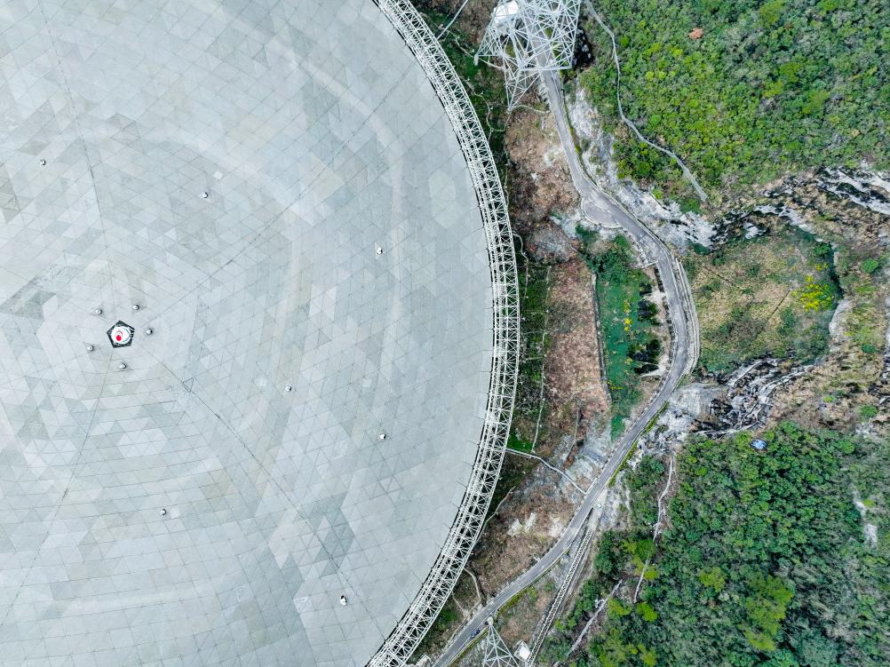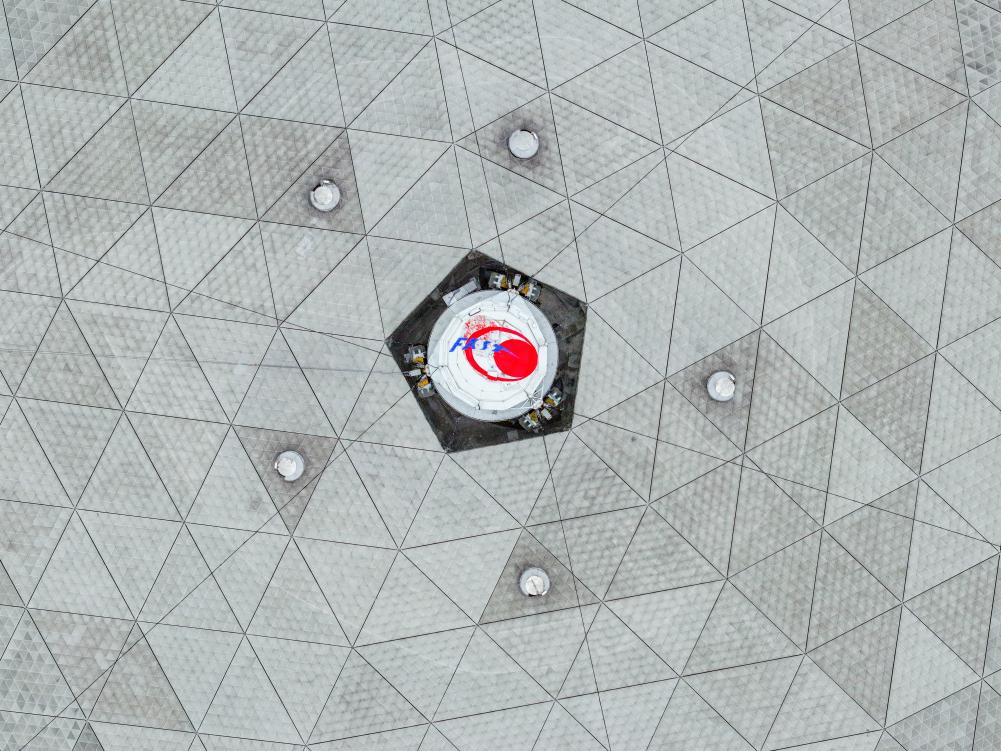 Dieses Drohnenfoto vom 18. Februar 2025 zeigt das chinesische sph?rische Radioteleskop mit fünfhundert Metern ?ffnung (FAST) bei Wartungsarbeiten in der südwestchinesischen Provinz Guizhou. (Xinhua/Ou Dongqu)