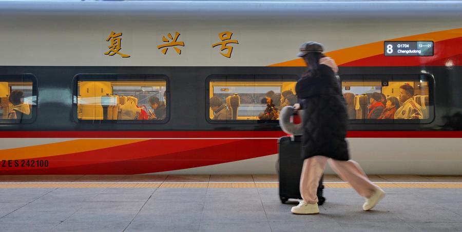 Passagiere sind am 22. Februar 2025 am Bahnhof Qinhuangdao in Qinhuangdao in der nordchinesischen Provinz Hebei auf dem Weg zum Einstieg in einen Fuxing-Hochgeschwindigkeitszug. (Foto: Cao Jianxiong/Xinhua)