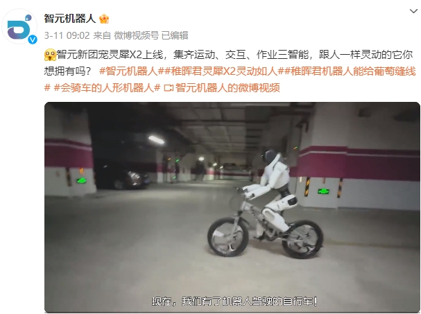 Humanoider Roboter ?Lingxi X2“ beim Fahrradfahren (Screenshot aus dem offiziellen Weibo-Account von AgiBot)