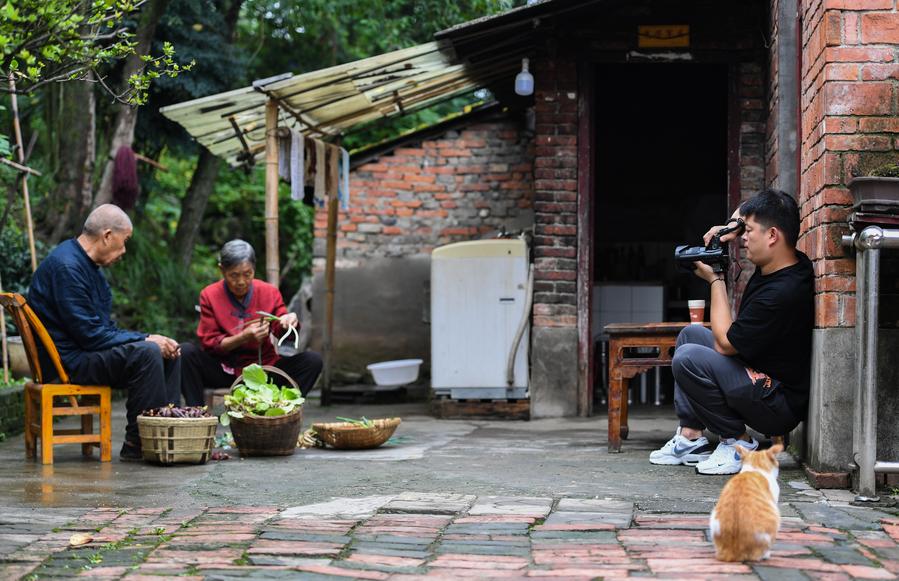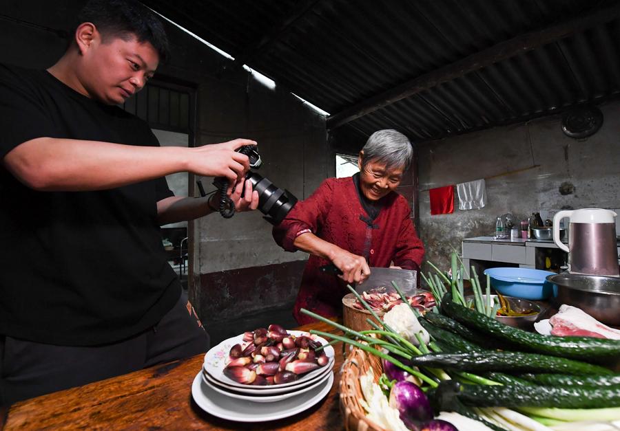 Zhang Wanlu (rechts) h?lt eine Szene am 21. September 2022 fest, in der seine Gro?eltern in Ankang in der nordwestchinesischen Provinz Shaanxi zu Hause Gemüse vorbereiten. (Foto: Xinhua/Zou Jingyi)