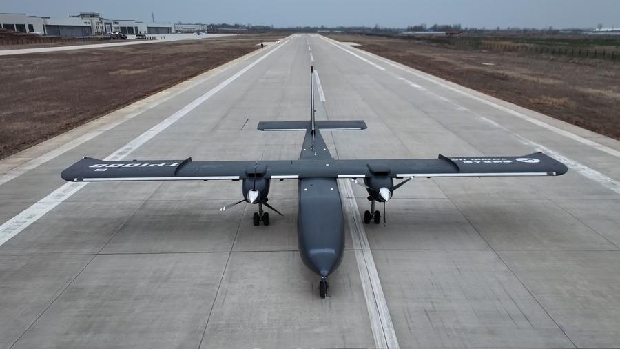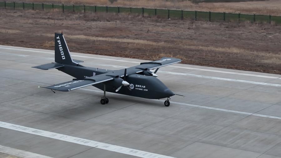 Die TP1000, Chinas selbst entwickelte Transportdrohne der 1-Tonnen-Klasse, auf ihrem Jungfernflug auf einem Flughafen in der ostchinesischen Provinz Shandong am 15. M?rz 2025. (Foto: Yi-Tong UAV System Co., Ltd./Handout durch Xinhua)