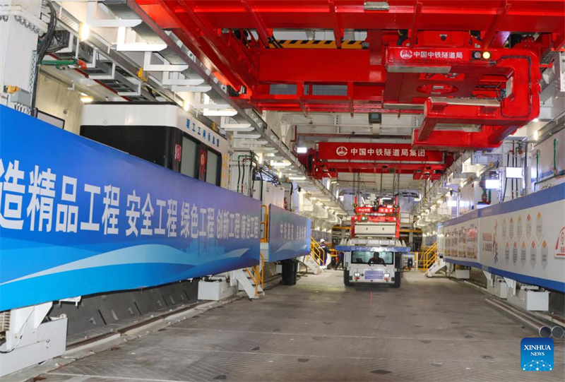 Ein intelligentes Montagefahrzeug arbeitet an der Gro?-Schildvortriebsmaschine ?Linghang“ auf der Baustelle des Chongming-Taicang-Tunnels, Teil der Hochgeschwindigkeitsstrecke Shanghai–Chongqing–Chengdu, unter dem Jangtse-Fluss, 16. M?rz 2025. (China Railway Tunnel Group/Handout via Xinhua)
