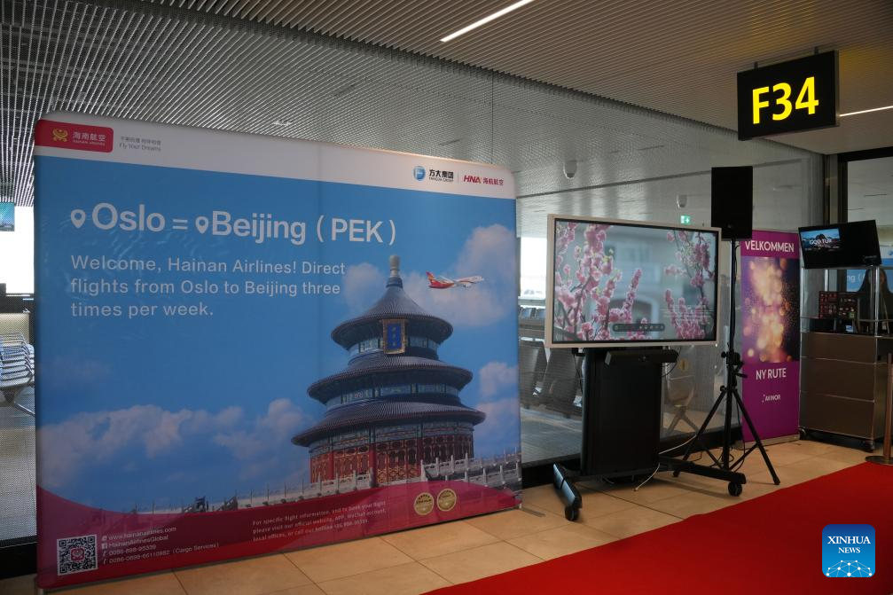 Dieses Foto vom 22. M?rz 2025 zeigt die Er?ffnungszeremonie der Hainan Airlines-Direktflugverbindung zwischen Beijing und Oslo auf dem internationalen Flughafen Oslo Gardermoen in der Region Akershus, Norwegen. Die chinesische Fluggesellschaft Hainan Airlines hat am Samstag offiziell die Direktflugverbindung zwischen Beijing und Oslo er?ffnet und damit die Flugverbindungen zwischen China und Nordeuropa weiter ausgebaut. (Bai Yun/Xinhua)